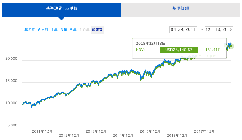直近のHDVのチャートは下記のようになっています。堅調に右肩上がりに推移しているのがわかります。
